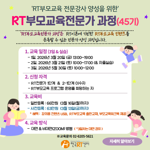 <45기 RT부모교육전문가 2급 과정 안내> 안녕하세요. 한국RT센터입니다. 2026년 45기 RT부모교육전문가 2급 과정 안내입니다. ‘RT부모교육전문가 과정’은 반응성 교수(RT) 이론을 기반으로 한 RT부모교육 전문 강사 양성과정입니다. 행복한 부모, 행복한 아이, 그리고 건강한 발달을 이끄는 ‘RT부모교육’ 전문 강사가 되기를 희망하는 분들의 많은 참여 바랍니다. ※ '한국RT센터' 홈페이지 → 신청하기 → 교육신청 → 45기 RT부모교육전문가 2급 신청 ※ 자세한 사항은 첨부된 공문을 확인해주시길 바랍니다.